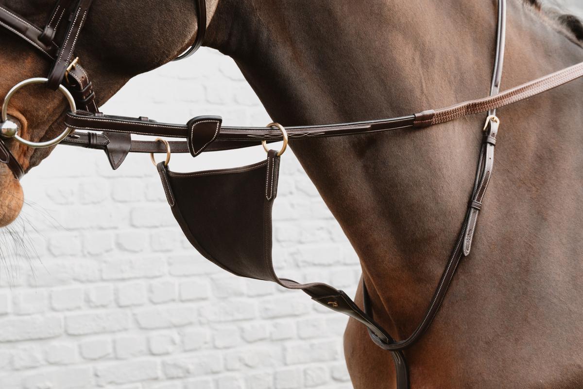 The martingale is part of the D collection, which means the color of the stitching Is cream and the buckles are golden. Available in brown and black.
