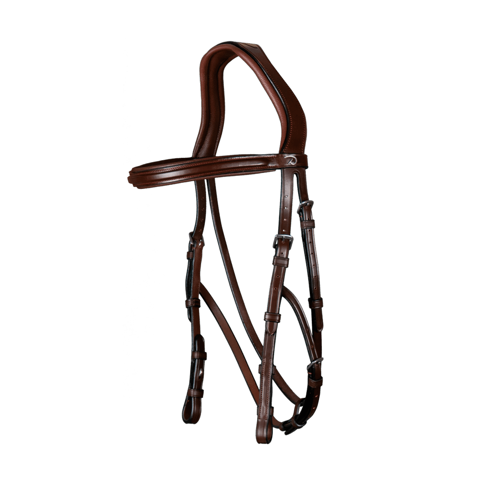 Slightly square-raised browband with decorative topstitching Headpiece has a single cheekpiece for the hackamore Hackamore cheekpieces with adjustable strap under the cheeks to keep them in place