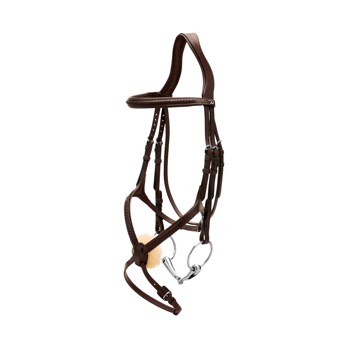 The bridle is part of the New English collection, which means the color of the stitching matches the color of the bridle. The buckles are stainless-steel. There are plaited leather details on noseband and browband. Available in brown and black.