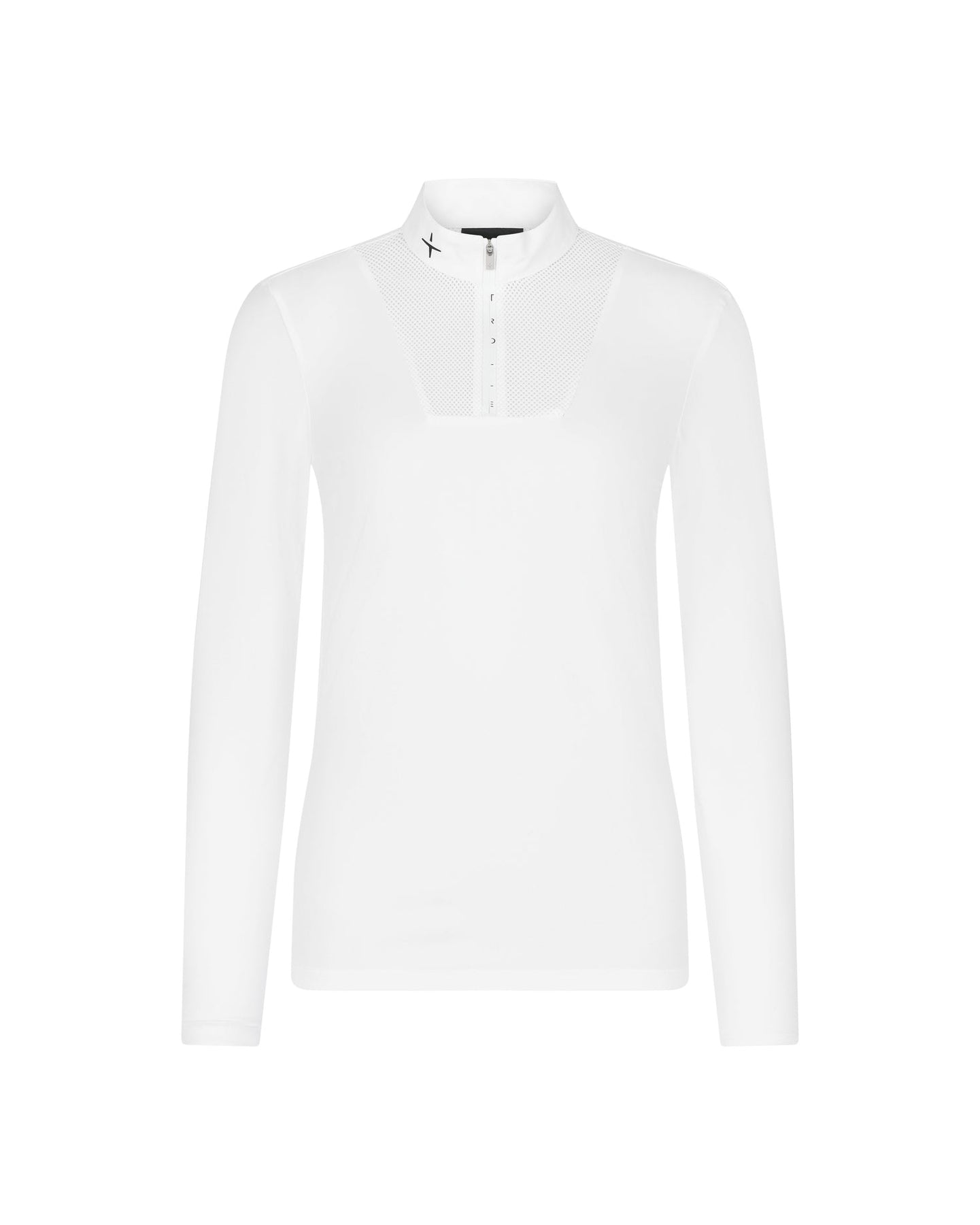 Designed for competition, this long-sleeve polo is crafted from breathable, quick-drying technical jersey to ensure comfort and performance. Mesh panels at the chest and back provide targeted ventilation and a sleek visual contrast. A crisp white collar and a sealed zip closure add a clean, competition-ready finish.